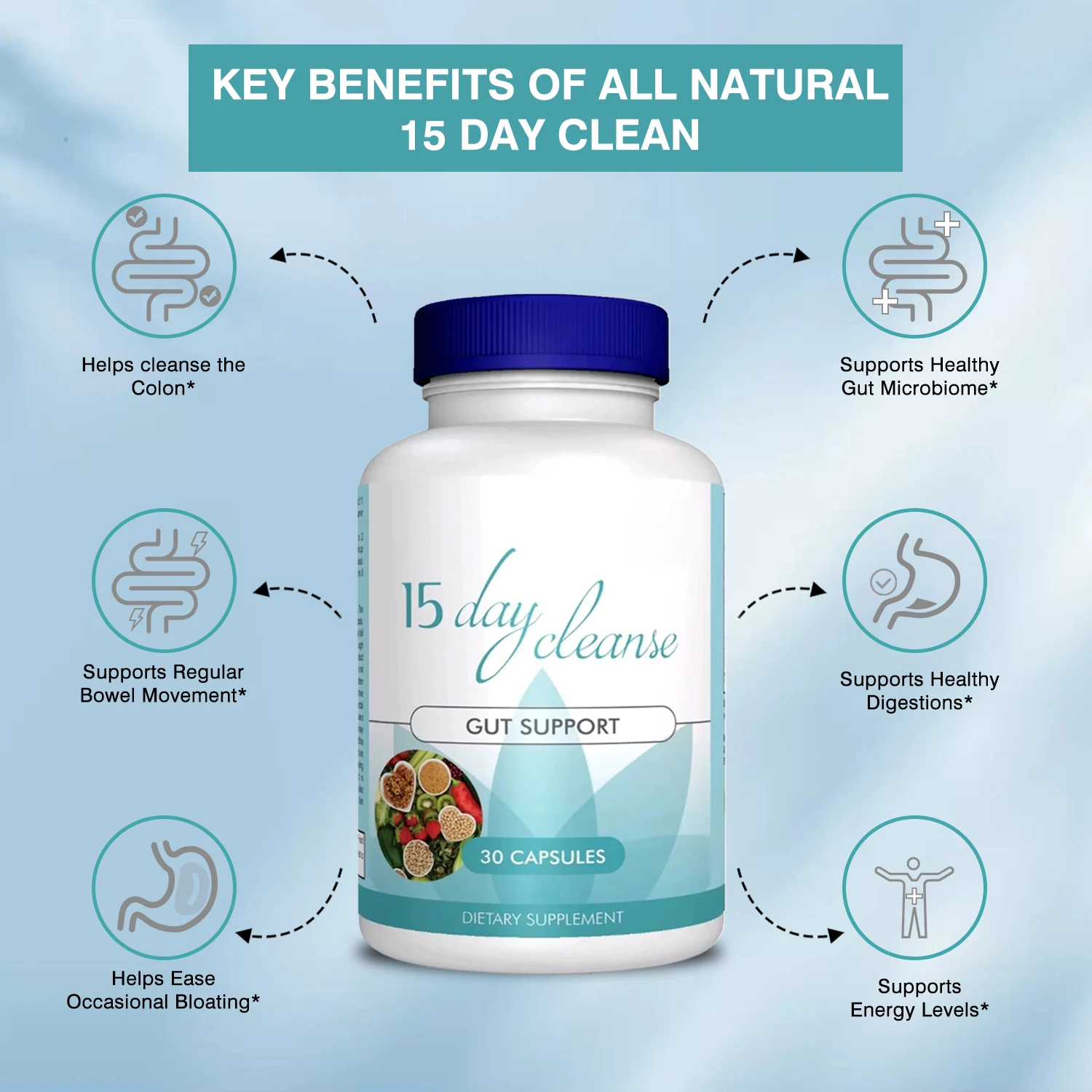 The average person carries between 5 and 15 pounds of waste in their intestines at all times. Regular bowel movements and emptying of the colon are highly recommended to improve abdominal pain, bloating, constipation, and increased risk of intestinal permeability. The 15-Day Cleanse helps clear toxin buildup from the intestines. You will feel the effects of this natural formula within 12-24 hours and expect to eliminate waste and feel better.