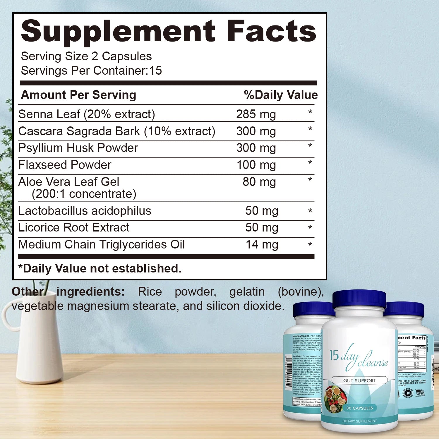 15 Day Cleanse - Gut and Colon Support, Advanced Formula with Senna, Cascara Sagrada & Psyllium Husk - 30 Capsules