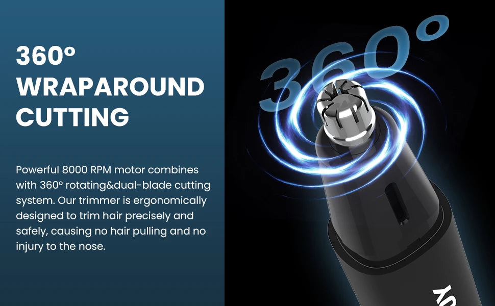 【Dual-Edge Spinning Blades】 This nose hair clipper features a double edge rotating blade system, 360 ° rotating internal design, Intelligent design features adapt to the contours of the nose and ear for precise trimming of hair or unwanted hair from nose, ears , eyebrows, beard and face.