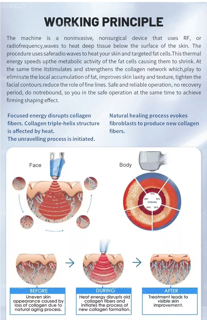 The ternary helical structure of collagen fibers is affected by heat and begins to disintegrate.Focused single-stage radiofrequency can quickly and effectively breakdown collagen fibers, separation of collagen tissue structure.The natural healingprocess, which stimulates collagen fibrils, makes it active in making new collagenfibers.The new amount of collagen isreassembled in the skin structure.