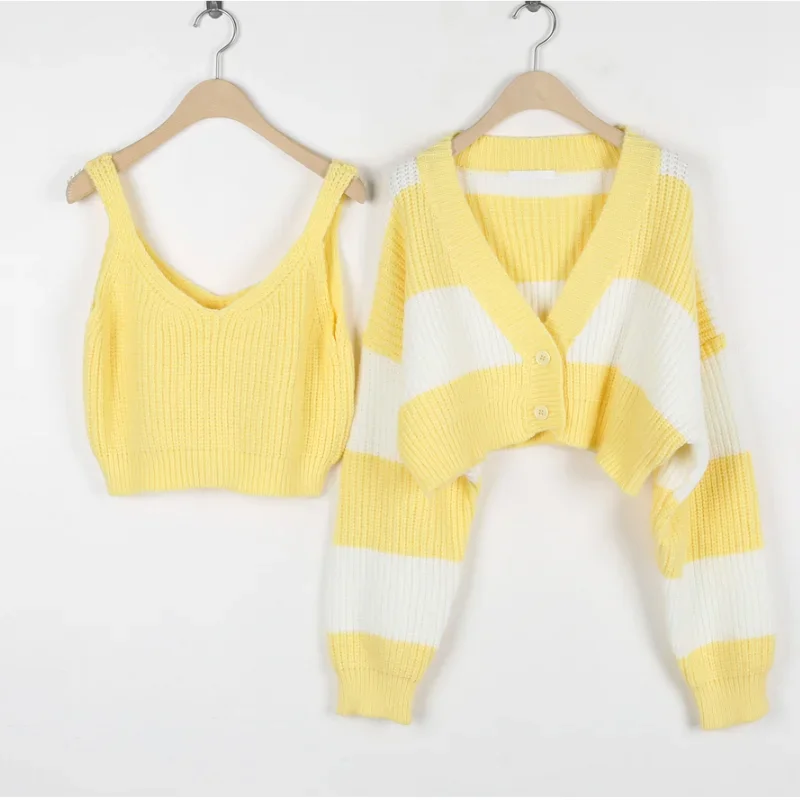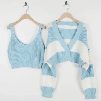2024 Fashion Autumn Two Piece Women Sweater Stripe Long Sleeve Cardigan Crop Knitwaers Winter Loose Casual Knitted Short Tops