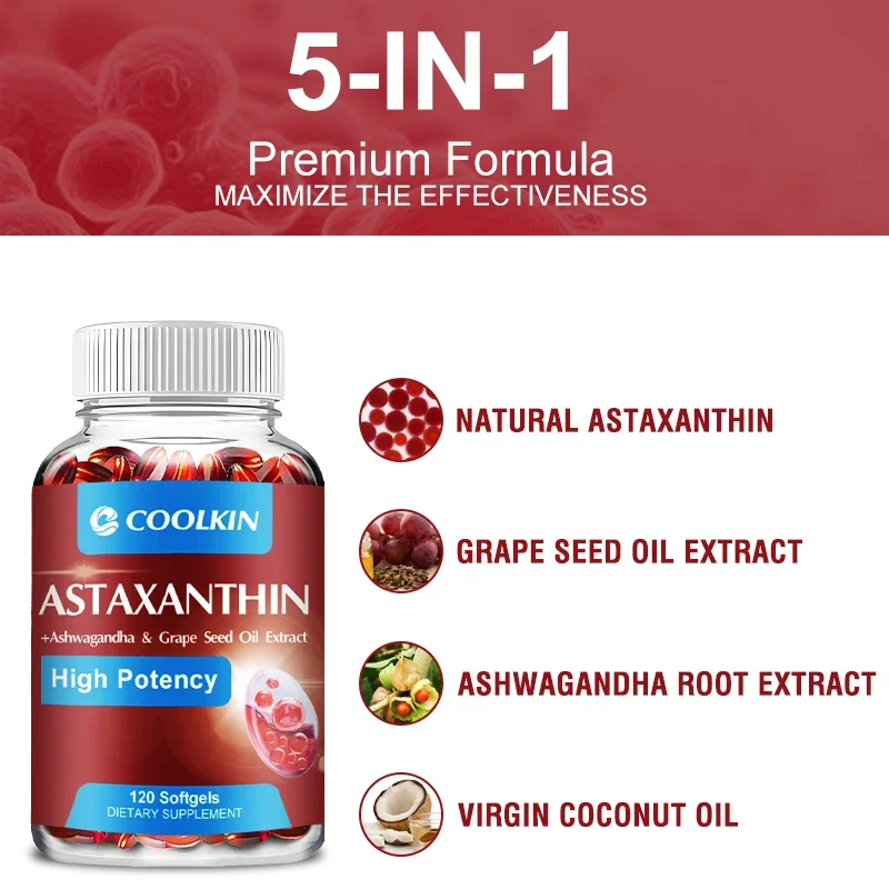 Ingredients: Astaxanthin, Grape Seed Oil Extract, Ashwagandha Root Extract