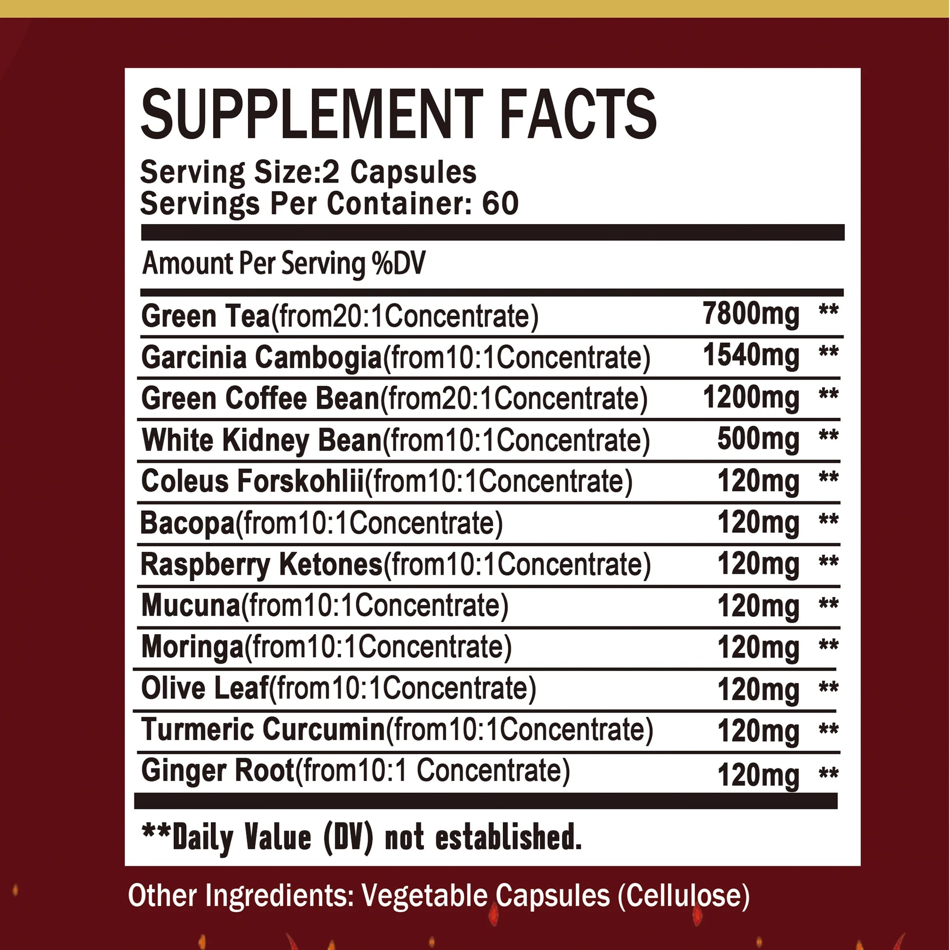 🔥Our fat burning capsules contain 12 of the most potent sources of fat burning energy: Garcinia Cambogia, Green Tea Extract, Green Coffee Bean, White Kidney Bean Extract and 8 others.
