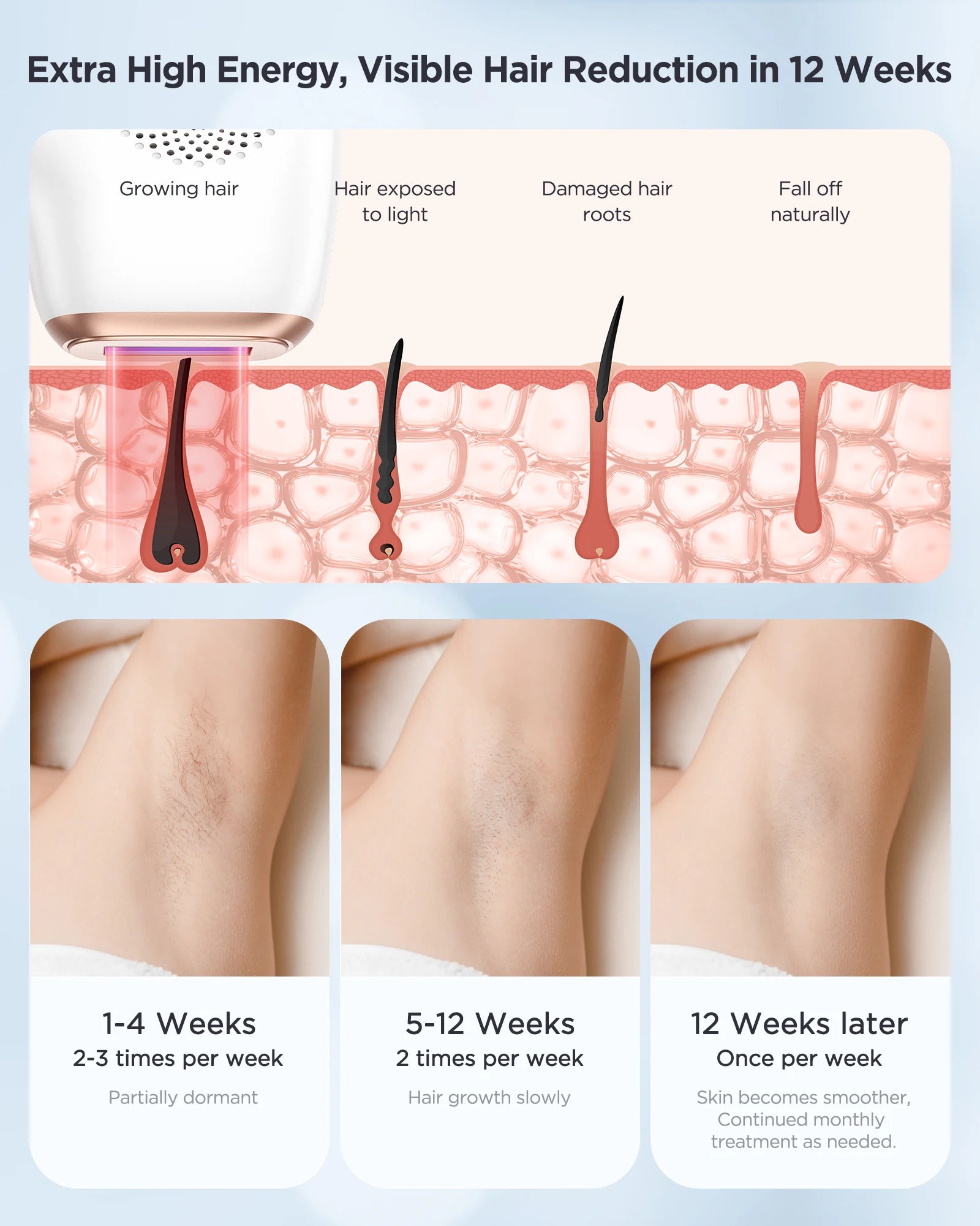 The IPL hair removal device uses Intense pulsed light (IPL) technology to reduce unwanted hair growth .The pursed light with 5J/CM²high energy and 600nm wavelength can arrive at the hair follicle to break the cycle of hair growth, kill the hair follicle more efficiently and safely.Within 12 weeks, you'll see up to 97% less hair.