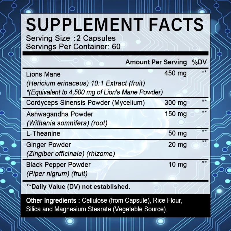 Lion's Mane Cordyceps Extract Cognitive Capsules, enhance memory, improve mental concentration, support immune system balance