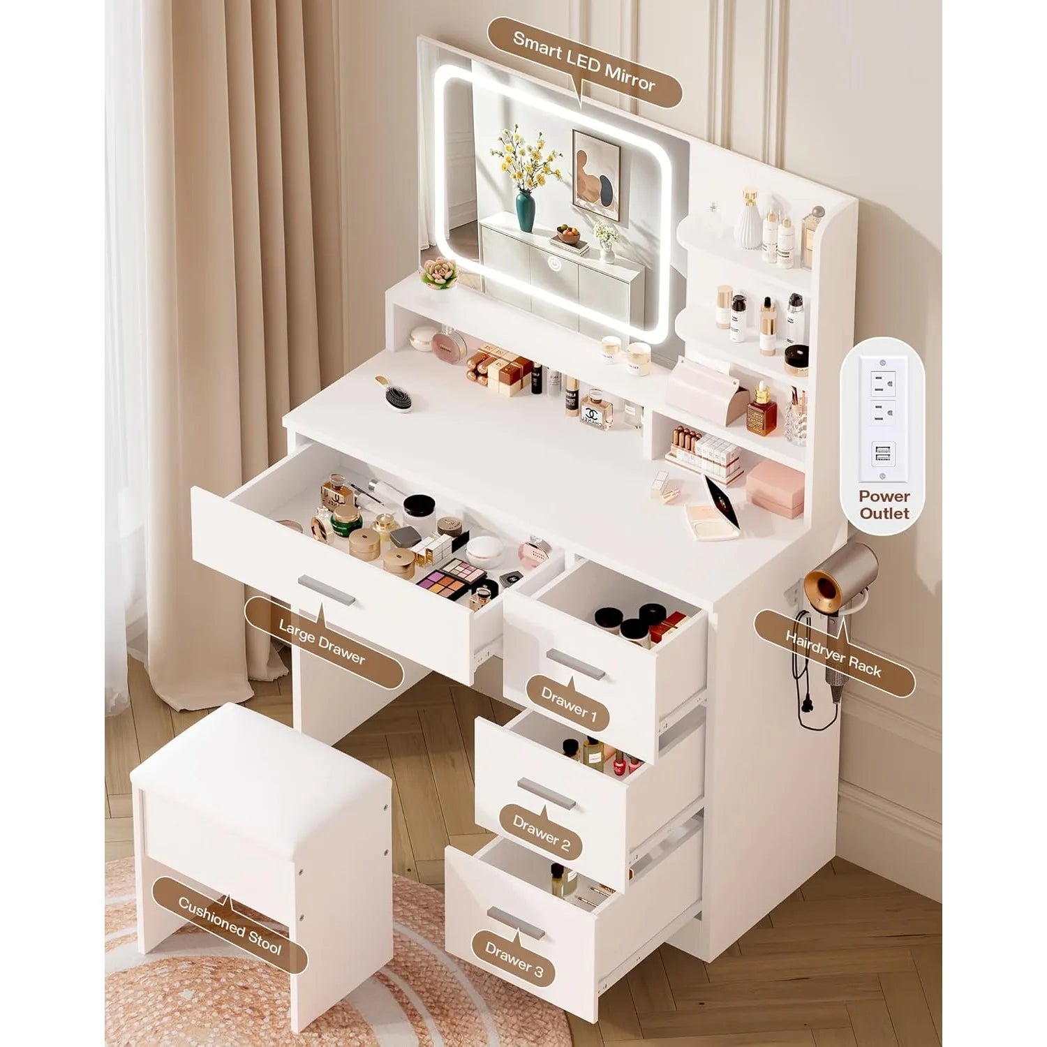 Makeup Vanity Desk, White, 35.4'Wx15.7'Dx53.9'H (Samrt LED Mirror, Open Shelves, with Cushion Stool, 4 Drawers, Hairdryer Rack,