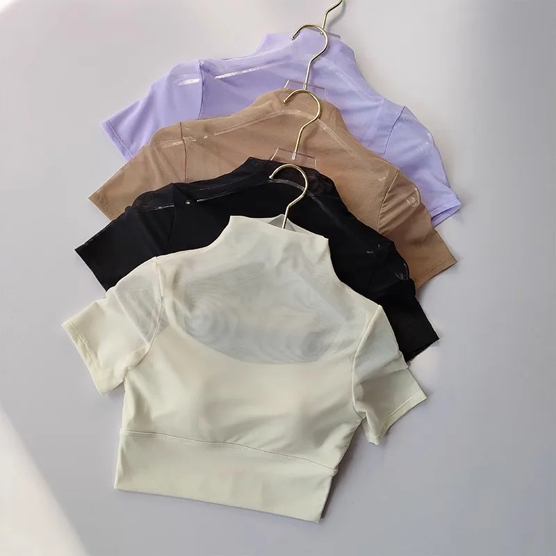 One-piece cup pads Sexy Mesh Yoga short-sleeved T-shirt Female Yoga Clothes Training Tights Pilates fitness Running Sports Shirt