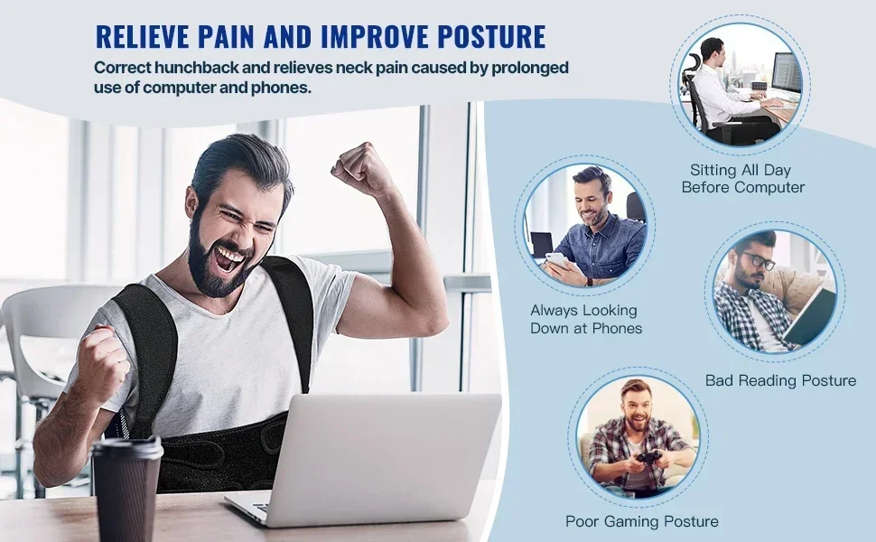 6. Improves Balance. The posture brace helps to eliminate back, shoulder, neck pain and lumbar pain, sprains and muscle spasms, improves balance and flexibility, and prevent further damage.