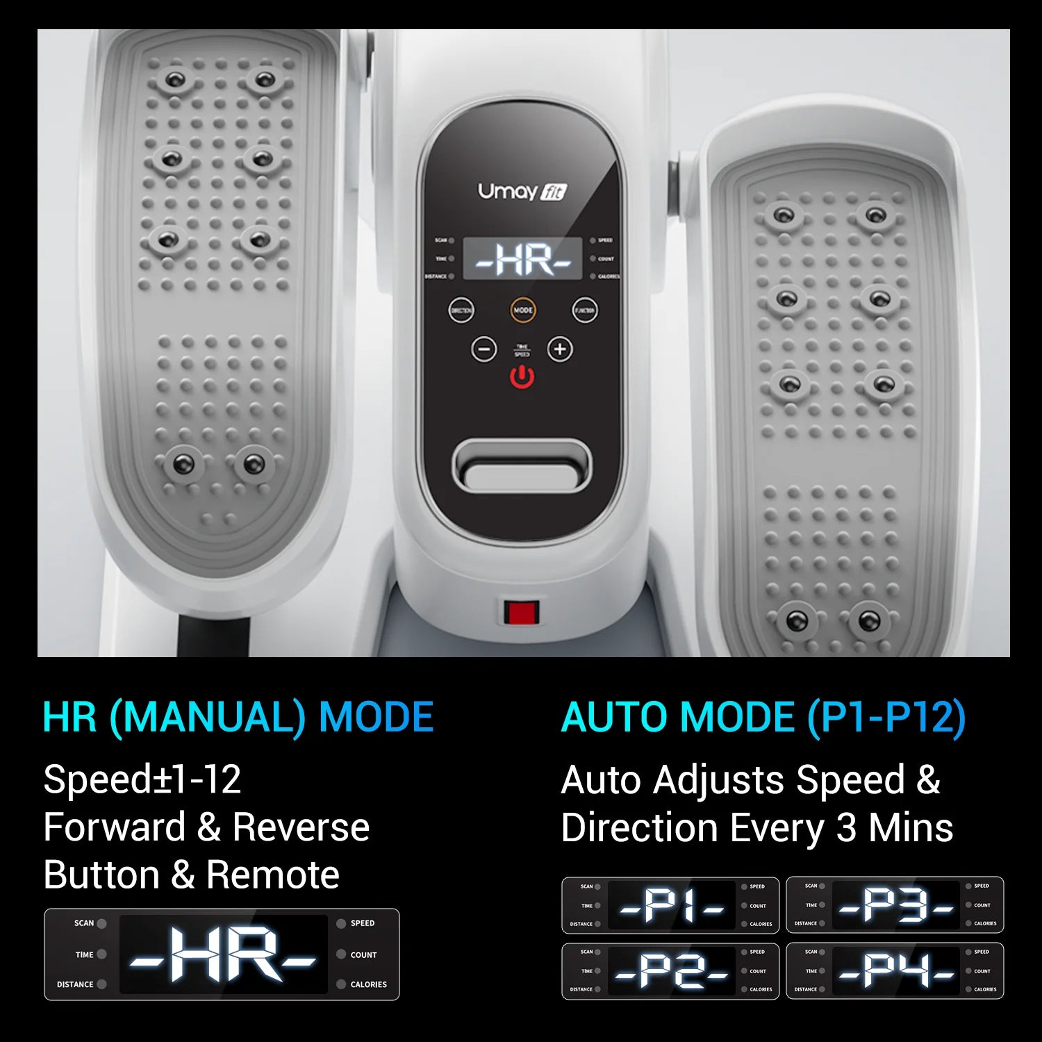 Auto & Manual Modes: UMAY elliptical provides Auto & Manual Modes for you, elderly people can choose 1-4 levels of low speed for leg exercise and relaxation. In Manual mode, you can set workout time of 15-30min, 12 speeds and forward&backward direction by remote control or button of the elliptical machine. The speed and direction have been programmed in Auto mode, you can adjust P1-P12 mode by press mode button, the speed changes every minute and the direction changes every 3 minutes