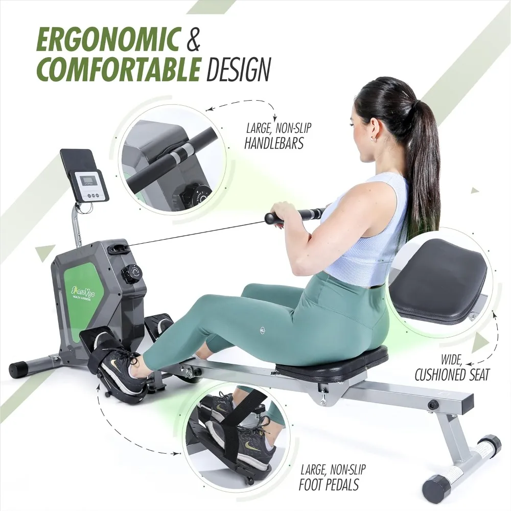 - EASY ASSEMBLY and foldable design for home or office storage. STURDY rail with comfortable large seating, designed for people between 4'8'' to 6'4'' and weigh up to 285 lbs. SMOOTH & QUIET 8-level magnetic resistance system provide men, women, seniors or elderly with different fitness goals for a low-impact indoor exercise.