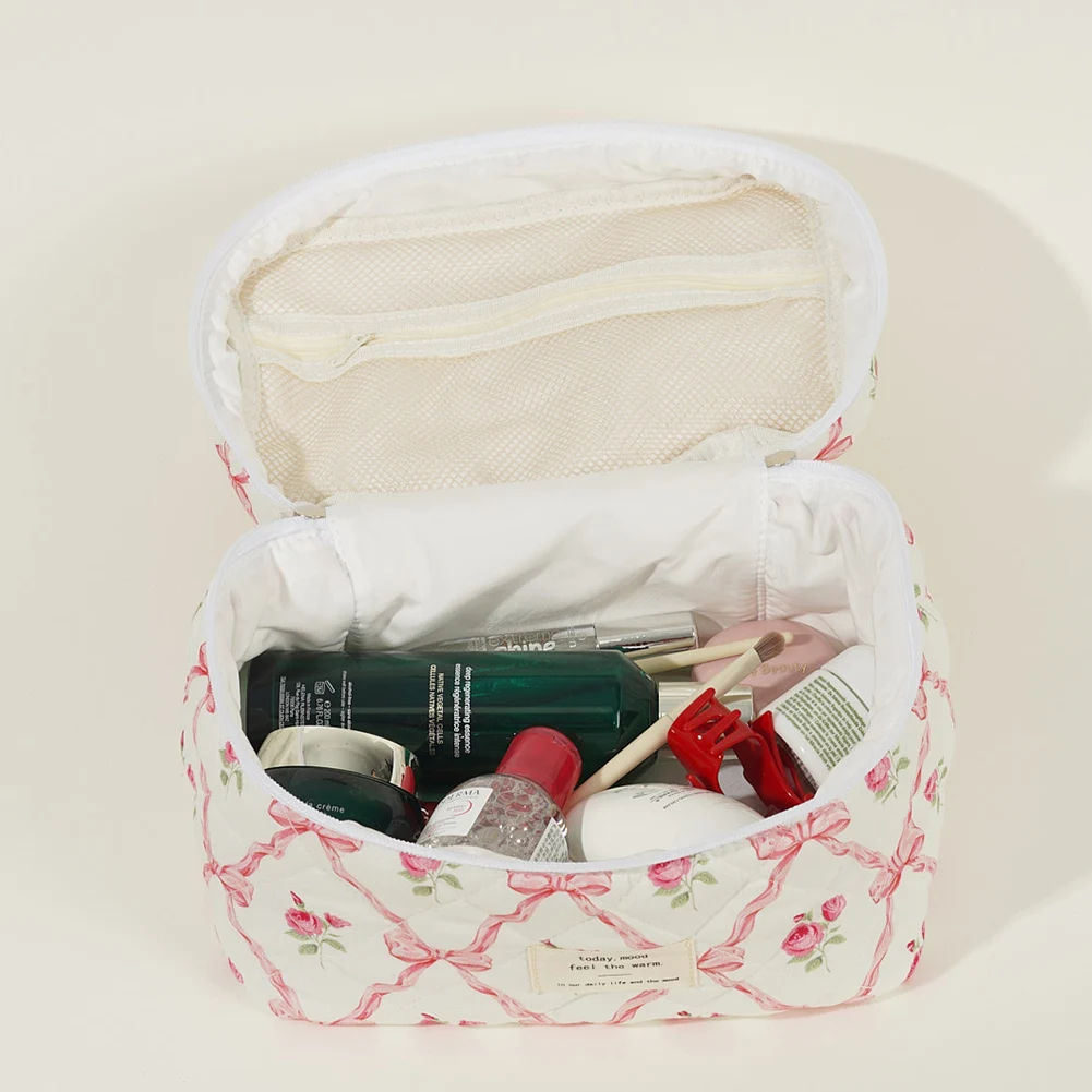 Three Piece Makeup Bag Set Floral Design Quilted Portable Cosmetic Pouch Ideal for Travel and Everyday Use