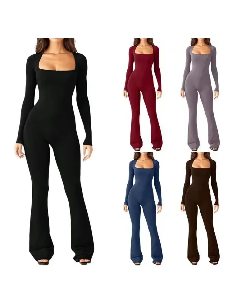 Women's Yoga Suit Long Sleeve Belly Tie Waist Hip Lift Square Neck Wide Leg High Elastic Jumpsuit